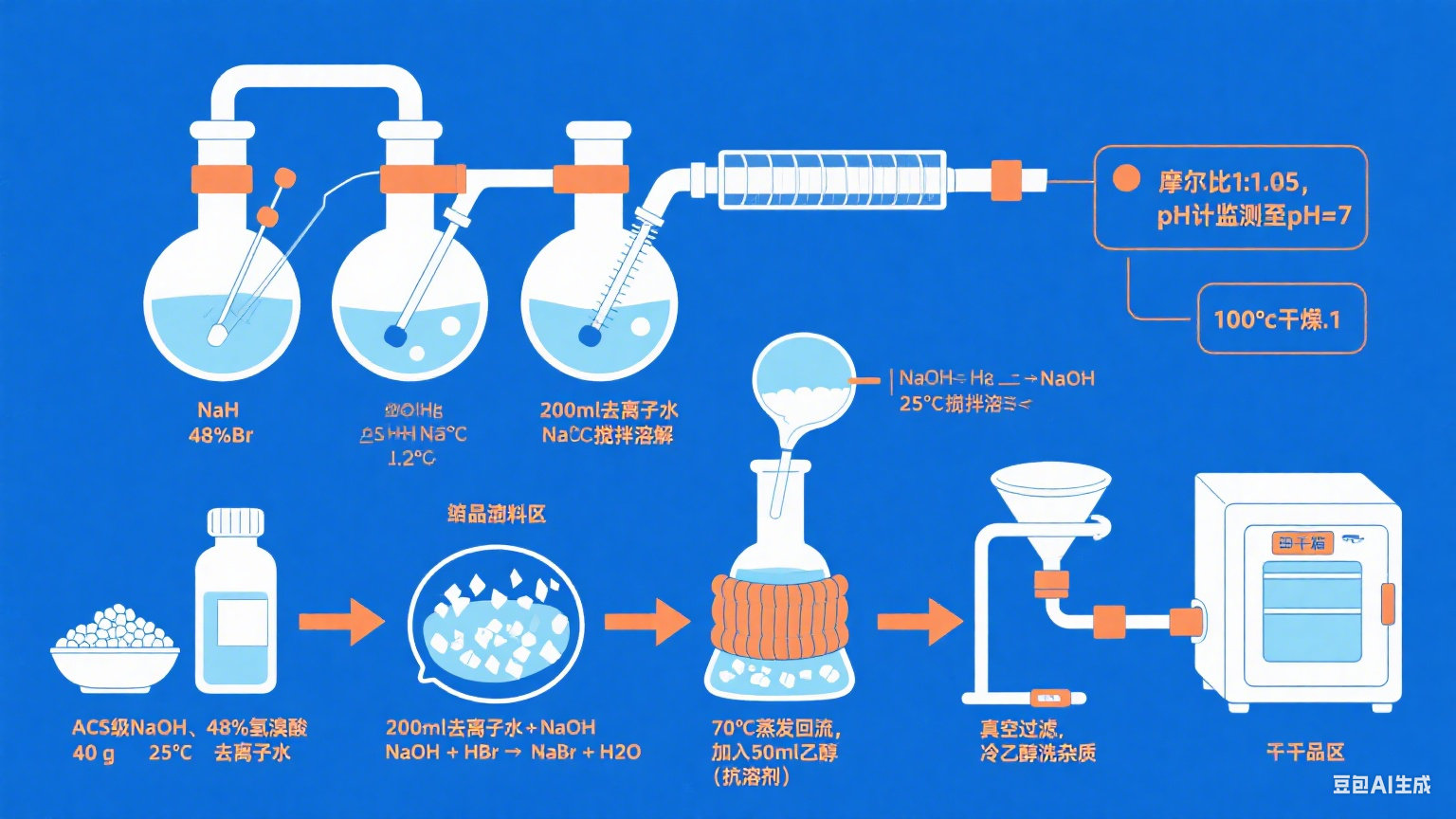 在持续搅拌的情况下,逐渐向氢氧化钠溶液中加入氢溴酸(HBr)。NaOH与HBr的摩尔比保持在1:1.05,以确保完全中和。通过pH计监测溶液,确认中和反应的完成,终点约为pH 7。